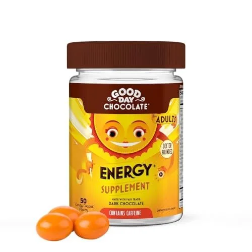 Good Day Chocolate Energy Supplements for Adults [50 Count] Fair Trade Caffeine Chocolate with B-Vitamins, Green Tea Extracts and 20 mg Caffeine Per Piece - Energy Booster for Women and Men